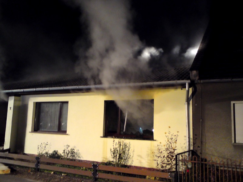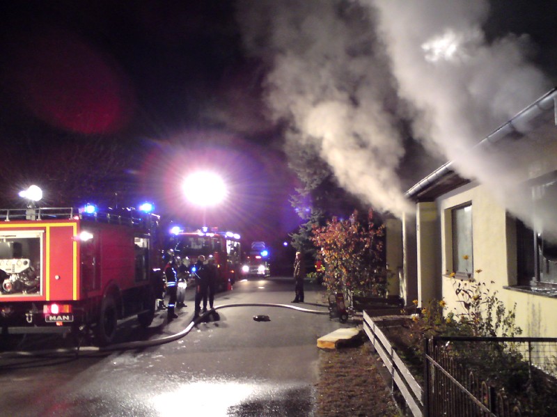 – Wasserversorgung auf der Rückseite des Gebäudes aufgebaut, Einsatzstelle ausgeleuchtet