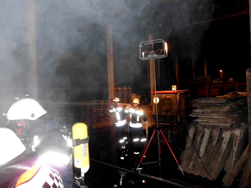 Eingesetzte Mittel Notstromaggregat, Lichtmast, Kabeltrommel, Stativ und zwei 1000Watt Strahler, 4 C Schläuche, 2 C Strahlrohre, 2 B Strahlrohre,
